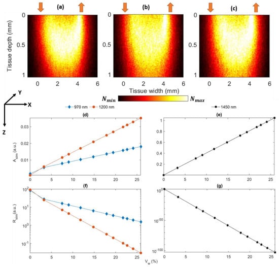 Monte Carlo simulation results at the wavelengths 970, 1200, and 1450 nm. The light–tissue interaction profiles are shown in (a–c). In the reflectance sensor geometry, the source (upward red arrow) and the detector (the downward red arrow) are separated by a distance of 5 mm. The simulations were carried out with the maximum hydrated skin at all wavelengths. Tissue depth and width are presented along the z- and x-axis, respectively. The variations in the simulated absorbance Asim and reflectance Rsim (presented in the logarithmic scale) with the increasing dermal water volume Vw (expressed in percentage) are shown at 970 and 1200 nm in (d,f), and at 1450 nm at (e,g), respectively.