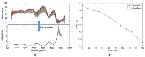 (a) The preprocessed spectra. (b) Interpolation of weights from the initial measurements.