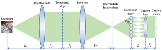 IIM consists of a conventional microscope and an MLA. The basic schematic diagram of the IIM is shown in Figure 1. An infinity-corrected optical system is placed between the intermediate image plane and the specimen. The sensor captures the elemental image array (EIA) through MLA installed in front of the camera lens (CL). The OVI is reconstructed from the disparity information using the EIA. The object point (x, y, z) is imaged on the EIA plane through the CL and elemental lens (EL) as Equation (1):