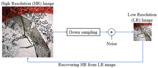 Deep learning has become popular for different applications [1,20,21,22,23,24,25,26,27,28,29]; single image SR (SISR) is one of them [27,28,29,30,31]. It is a very challenging problem due to the transformation of a specific low-resolution (LR) image to a high-resolution (HR) image. The main mechanism behind SISR is that it takes the original HR image and downsample multiple times to the LR image that is fed to the network to train the model. The main working principle of the SISR algorithm is shown in Figure 2. Original HR images are downsampled and convolved with noise known as kernel by the scaling factor. The LR image y can be modeled as Equation (3):