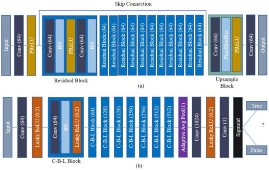 where is the input of the hidden layer on the ith channel, is the coefficient of the negative part that controls the slope. The value of is learned via backpropagation during training time. When the value of is 0, it works as a ReLU activation function. The convolution layer consists of 9 × 9 kernels and 64 feature maps with padding 4. Apart from the original SRGAN, twelve residual blocks are used in the generator network. Each block consists of two convolutions followed by batch normalization (BN); after that, a PReLU is employed; the kernel size is 3 × 3 and the padding is 1 for both convolution layers. Due to the change of parameter in each layer for training, the learning rate reduces gradually with saturating nonlinearities. In that case, BN performs normalization for each mini-batch; hence, it allows a higher learning rate [43]. In the last residual block, there are 64 channels and 64 feature maps with kernel size 3 × 3 and padding 4. To enhance the resolution of the LR input image, an upsample block is used, which consists of a convolution, pixel shuffler, and PReLU layer. A single pixel-shuffler is useful for efficient sub-pixel convolution where the super-resolution takes place in the LR instead of the HR space [44], whereas two are used in the SRGAN. It helps to retrieve the color consistency of the IIM. In this upsample block, the channel size is the same as the residual block; however, the feature map size is calculated by multiplying the channel size and the square of the up-scale factor; kernel size and the padding is 3 × 3 and 1, respectively. In the gradient-based learning method, vanishing gradient plays a vital role, sometimes the network may stop learning. To overcome this, a skip connection is established between the input and the upsampling block to prevent the gradient vanishing problem where the weight value is calculated from the previous layer. The final convolution layer contains three output channels and a 9 × 9 kernel size with padding 4.
