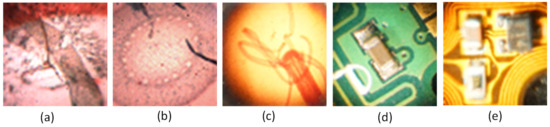 Different types of specimen: (a) honeybee, (b) Z. Mays, (c) hydra, (d) chip, and (e) printed circuit board (PCB).
