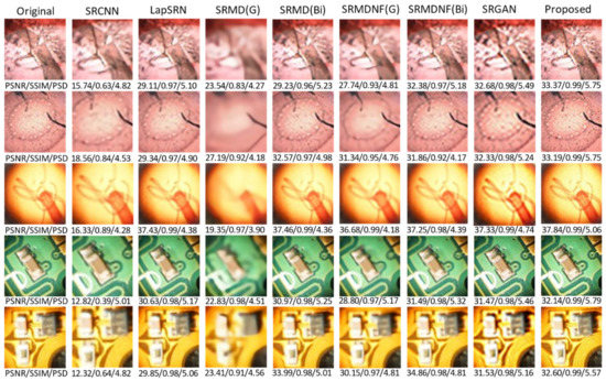 ×4 upscaling comparison. The SRCNN, LapSRN, SRMD, SRMDNF, and SRGAN algorithm are compared with the proposed method. In all cases, the proposed method performs better than others, and the super-resolved image is almost indistinguishable from the original.