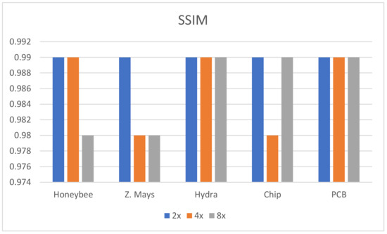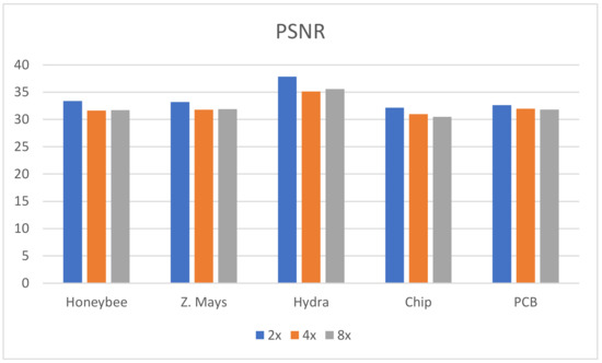 From the table, in most cases, the PSNR, SSIM, and PSD values are higher for the proposed algorithm, which verifies that the method is highly suitable for microscopic specimens. There is only one case found for the PCB ×2 upscaling factor where the PSNR value is higher for the SRMDNF bicubic interpolation technique. This is because of the algorithm properties and PSNR calculation technique. SRMDNF enhances the image quality without seriously considering the edges. If we take a closer look at Figure 7 and compare the PCB specimen with the SRMDNF and proposed algorithm, there is a huge edge difference. The microwires are clearly visible for the proposed algorithm but not in the SRMDNF (it seems like a single wire stripe). Since the PSNR considers the mean square error and the output is brighter for SRMDNF, it provides a higher PSNR value. However, the SSIM and PSD values are higher for the method applied here. It is a considerable flaw that most of the algorithm does not support (possibly very noisy and low-quality output) more than ×2 or ×4 upscaling except SRGAN, which is a great advantage for this algorithm [51]. The ×8 upscaling results for the different specimens are shown in Table 3. The results are reasonable. It is observed in Table 1, Table 2 and Table 3 that the PSNR, SSIM, and PSD values are almost identical to different quality measurement techniques, which verifies that the proposed method can retrieve a good quality image for even an ×8 upscaling factor. The comparison between the PSNR, SSIM, and PSD values for different upscaling factors are shown in Figure 10, Figure 11 and Figure 12, respectively. The quality and scaling factors are inversely proportional. The higher the scaling factor, the less image quality is. The PSNR values for honeybee, Z. Mays, hydra, chip, and PCB are (33.57, 33.19, 37.84, 32.14, 32.60), (31.63, 31.79, 35.14, 30.98, 31.95), (31.71, 31.89, 35.59, 30.48, 31.81) for ×2, ×4, and ×8 upscaling, respectively. Figure 10 shows that the PSNR value is always higher and relatively lower for the ×2 and ×8 upscaling, respectively. The structure of the generated images is also better for ×2 upscaling (shown in Figure 11), though it is very similar to others. The SSIM values for honeybee, Z. Mays, hydra, chip, and PCB are (0.99, 0.99, 0.99, 0.99, 0.99), (0.99, 0.98, 0.99, 0.98, 0.99), (0.98, 0.98, 0.99, 0.99, 0.99) for ×2, ×4, and ×8 upscaling, respectively. The PSD values are loosely related because they depend on the specimen. Brightness and sharpness are completely different from each other. The PSD values for the honeybee, Z. Mays, hydra, chip, and PCB are (5.75, 5.75, 5.06, 5.79, 5.57), (5.76, 5.76, 5.07, 5.78, 5.56), (5.74, 5.74, 5.04, 5.79, 5.18) for ×2, ×4, and ×8 upscaling, respectively. PSD values are calculated in the decibel (dB) unit. It is shown in Figure 12 that the PSD values vary across different specimens. The quantitative results show that the output image is good enough to perceive a better microscopic view. However, the adversarial network produces some additional noises.