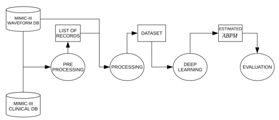 Figure 1 shows a block diagram of the proposed methodology. Data for this work come from two public available databases: MIMIC-III MWDB and MIMIC-III CDB. The first one contains over 20,000 waveform records digitized at 125 Hz from more than 10,000 distinct patients in intensive care units and the second one includes information such as demographics, laboratory and microbiology test results, cardiology and radiology reports, and diagnostics. In preprocessing stage, records from MIMIC-III MWDB with invasive ABP and fingertip PPG signals are selected, then their corresponding subject’s age and gender were obtained from MIMIC-III CDB. In processing stage only segments with enough signal quality (SQ) are kept and each morphology of the average ABP pulse () is computed. Deep learning stage compromises the model architecture, hyperparameters settings, and training phase to get the estimated () from PPG signal. Finally, the values and time occurrences from are evaluated. Each stage will be detailed in the next subsections.