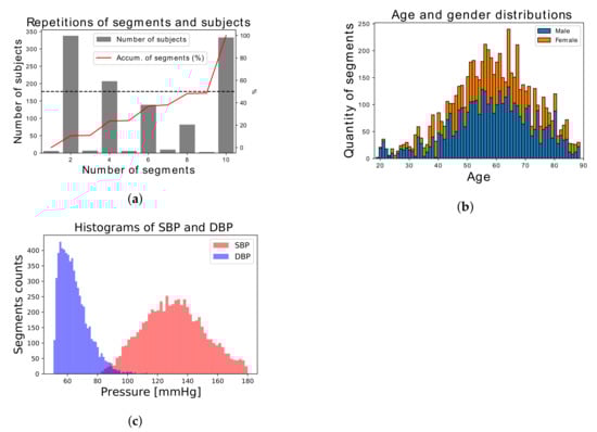 Selected dataset distributions: (a) Number of subjects with their corresponding quantity of segments (gray bars) and segments cumulative percentage (red line). (b) Age and gender. (c) Systolic blood pressure (SBP) and diastolic blood pressure (DBP).