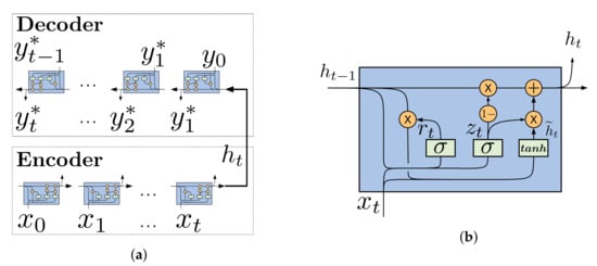 (a) recurrent NN (RNN) Encoder-Decoder architecture. (b) Structure of gated recurrent units (GRU) unit.