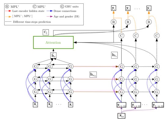 Figure 6 shows the model architecture. It is constituted by three main parts: encoder, decoder, and attention modules. The encoder consists of three bidirectional GRU (Bi-GRU) layers, while decoder consists of three GRU and two multiperceptron layers (MPL) ( and , respectively). Both encoder and decoder have dense connections [39] to improve the information flow between layers (blue arrows, Figure 6). Input , with , is the mentioned 5-s PPG and PPG’ input signal. The whole encoder outputs () go to attention module. In addition, the last hidden state () from each encoder GRU layer is used to initialize the hidden states of the corresponding decoder GRU layer (red arrows, Figure 6). The output of last decoder GRU layer () is sent to the both attention module and layer. Context vector () and are concatenated and transferred to . Finally, and outputs are concatenated (orange arrows, Figure 6) to produce a prediction time-step (). Age and gender demographic information vector () is concatenated at each time-step with to conform the decoder inputs (). In particular, is a vector full of ones used to indicate the start of a prediction.