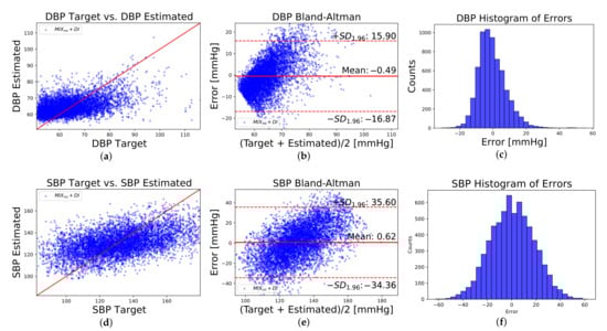Bland–Altman plots were performed using SBP and DBP predictions of each of the 5 fold per scenario. Bland–Altman results are shown in Table 5 in terms of mean () and limits of agreement (). In particular, Figure 9 shows regression plots, Bland–Altman plots, and histograms of errors corresponding to scenario.
