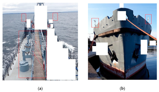 Top view of the antenna array (a) and additional reference antennas on front of ship (b) (some parts of the picture are masked for security and privacy reasons).