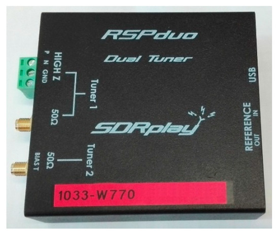The RF signals were downconverted and digitized in two RSPduo devices (shown in Figure 4), which are compact dual-tuner SDR receivers from SDRplay [14], intended for general purpose SDR applications in the frequency range from 1 kHz up to 2 GHz [16]. The sampling rate was set to Fs = 2 MHz, which allows it to receive the whole bandwidth of the DAB signal. In the case of the DVB-T signal, only a part of the bandwidth is acquired in this way. The remaining out-of-band components are filtered out through the RSPduo tuner, thanks to internal oversampling and anti-aliasing filters.