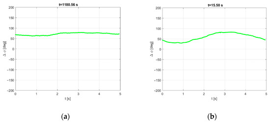 We must note that, during the storm, the ship swayed intensely in the rough waves and changed, to a small extent, its orientation relative to the illuminating transmitter. As the reference antenna was located at the front and the surveillance antennas were placed on the port side of the ship (see Figure 3), the distance between these antennas was several meters. As a result, both the phase and amplitude of the direct signal in the reference and surveillance antennas depended on the vessel’s pitch and roll, and the phase offset between the reference signal and its crosstalk in the measurement signal was changing during the integration time. On the other hand, the clutter removal filter requires a constant phase relationship between these signals during a single block’s coherent processing, such as in stationary PCL installation. Figure 8 shows the example plots of the discussed phase offset, estimated with 2 ms time steps during one integration period—in the cases of calm seas and the storm.