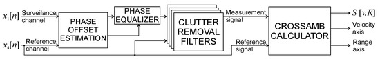The phase difference between the reference signal and its crosstalk fluctuated in both cases due to the ship’s movement. However, during the storm, these fluctuations were found to be much more intense. Our experiments with PCL signal processing have shown that these fluctuations severely degrade the clutter removal filter’s efficiency in the case of the long integration period. In such a case, because of the loss of coherency, it is almost impossible to filter out the direct path interference component and obtain clear PCL images. To address this problem, a more advanced signal processing algorithm has been developed with the structure presented in Figure 9.