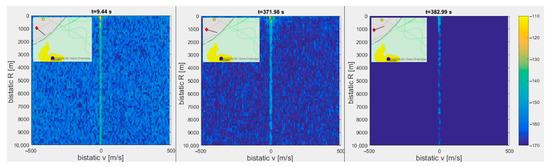 In moving PCL platforms, the residual clutter structure and intensity change as the platform is moving and changing its orientation [18,19,20,21]. In Figure 11, we can see that the ship is turning over a port, which changes the direction of the antenna array with respect to the illuminating transmitter. This change entailed a drop in the clutter intensity by 15 dB (the same color scale is used on three plots). In all cases, only the direct leakage signal was removed by an adaptive lattice clutter canceler [22] with the length of filtration truncated to the first two range cells.