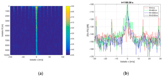 The residual clutter structure in marine PCL installation also depends on the sea state as determined by weather conditions. The clutter image observed during calm seas is depicted in Figure 12, with cross-sections for different bistatic ranges (R). For this experiment, the DAB transmitter (218.64 MHz) was selected for illumination, and the integration time was extended to 5 s to improve the resolution in Doppler frequency and bistatic velocity. The short parts (52 ms) of the signal with interference from the training sequence were excluded from each integrated block’s processing to obtain clear images.