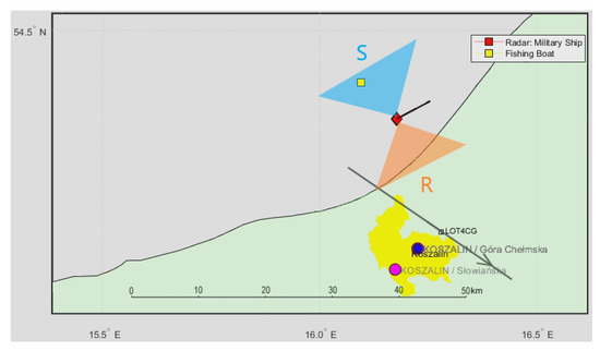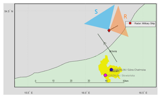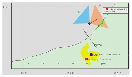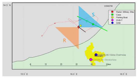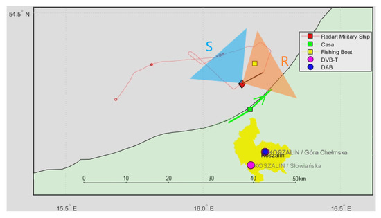 In Figure 14, we can see a situation map with the military ship (carrying the PCL receiver) marked with a red square, a cooperative CASA C-295 aircraft [25] passing around 10 km from the ship (green mark), a cooperative fishing boat in the close surroundings (yellow mark), and an accidentally passing cruise plane SAS756 (white square). The boresight directions of the surveillance (S) and reference (R) antennas have been illustrated with triangles of different colors.