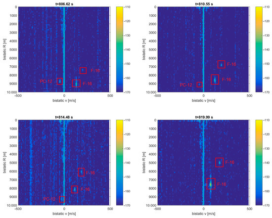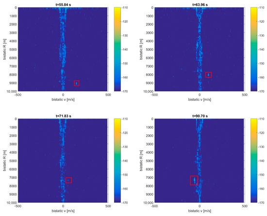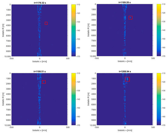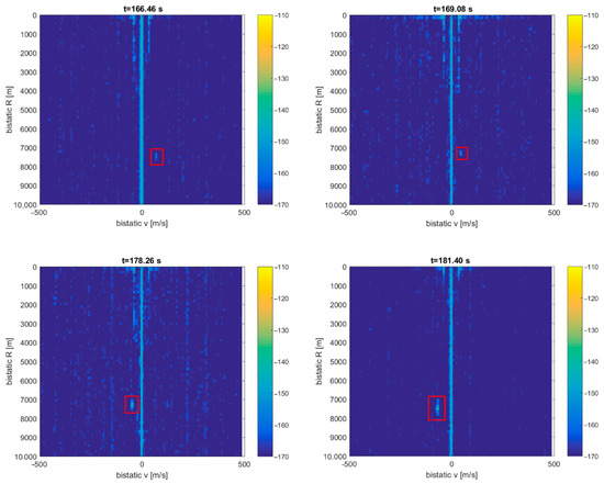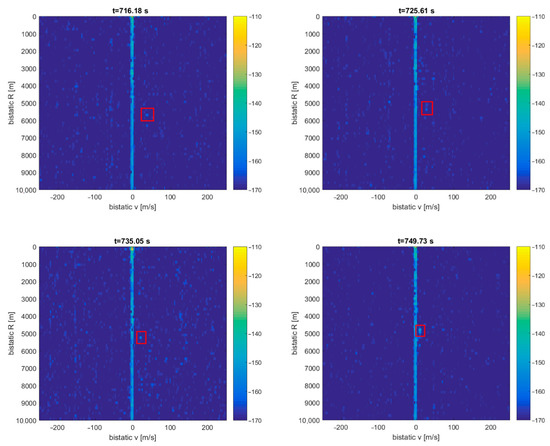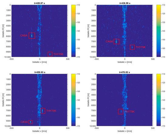 The CASA aircraft’s detection results can be seen in Figure 17 as a dot moving in the bistatic v/R plane (from 3 to 1 km), marked with a red rectangle (the consecutive v/R maps are separated by 10 s). The intensity of this echo increases as the aircraft gets closer to the PCL receiver. The detection falls into the clutter area (v = 0) as the aircraft is flying above the transmitter–receiver baseline. The echoes from the fishing boat cannot be extracted from the plots since they are lost in the clutter.