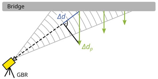 Since the GBR always measures displacements in LOS, a projection to a Cartesian coordinate system is needed to generate comparable results between different measurement setups. Additionally, the measurements in LOS may contain displacement components from more than one bridge axis. In general, bridges have the highest displacement amplitude in the vertical axis. Displacements in the direction of the transversal or longitudinal axis are smaller, but can still influence the measurement in the vertical axis depending on the setup []. By using more than one GBR simultaneously, it is possible to separate the displacement components for different axes.