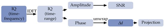 Processing of the raw measurements is needed to receive comparable displacement measurements between different range cells and measurement setups. The GBR measures the in-phase and quadrature components (IQ) of the received signal in the time-frequency domain (see Figure 2). With an Inverse Discrete Fourier Transform (IDFT), these components are transformed to the time-range domain. The amplitude and wrapped interferometric phase are calculated by the absolute and the argument of the transformed IQ components. The wrapped phase has values in the interval , leading to jumps when the interval is exceeded. Unwrapping the phase removes these jumps by adding or subtracting  when the difference between consecutive samples is greater than . The displacement  in the LOS of the GBR