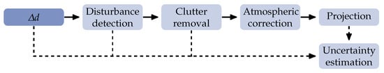Finally, the processed LOS-displacements are projected to a Cartesian coordinate system with a generalised approach, proposed in Li et al. [] and Monti-Guarnieri et al. []. With the application of additional GBRs, the components of the three-dimensional displacement vector can be separated. The projection and its influence on measurement uncertainty depending on the GBR setup is discussed in Section 2.6.