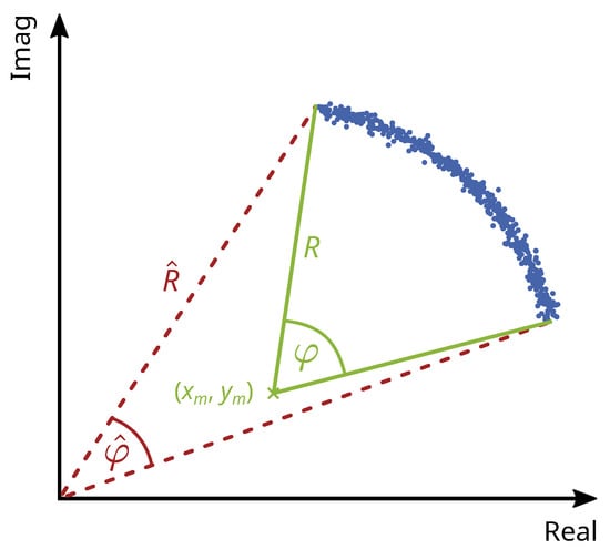 The measurement can be influenced by unwanted targets in the same range cell as the measurement target, since the GBR always measures the sum of the complex IQ components. This clutter can be removed if it results from static targets that have a systematic influence on the measurement [,]. The effect is best shown in a phasor plot of the complex signal (see Figure 4). A moving target’s phasor plot shows a circular arc with a radius R corresponding to the signal amplitude and a central angle  corresponding to the signal phase. Static clutter increases the signal amplitude but has no effect on the phase. Therefore it adds a systematic deviation to the origin of the arc, and the phase and amplitude of the moving target are over- or underestimated with  and . Since the measurement uncertainty is dependent on the mean value of the amplitude, it is over- or underestimated as well. In the following Section 2.4.1, we propose a combination of two circle fit algorithms already used in various other disciplines to estimate the true origin  of the arc. The combination of two algorithms is necessary because bridge displacements usually do not produce a full circle, only a circular arc with a small central angle. The proposed combined approach estimates the origin more reliably. Section 2.4.2 addresses further challenges in circle estimation. For example, we introduce a weight matrix to compensate for an uneven distribution of datapoints, resulting in a more reliable estimation.