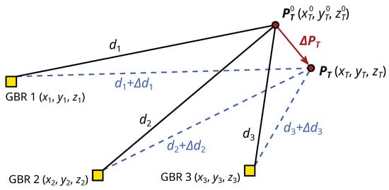 between the i-th GBR () and the target. Since the target displacements are differential, we can linearise the distances  at the initial target coordinates