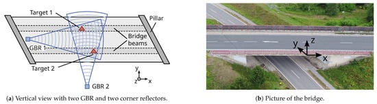 Traditionally, strain gauges, accelerometers, and other directly contacting sensors are used to monitor the dynamic properties. Since these sensors are mounted directly on the bridge underside, their application can be complicated or even impossible, depending on the bridge’s construction. The installation can also interfere with the regular bridge operation and have a significant setup time (e.g., []). In recent years, remote sensing techniques such as ground-based interferometric radar (GBR) have become more common for infrastructure monitoring. GBR is able to measure the displacements of several points with precision in the sub-millimetre range at a sampling frequency of up to 200  []. Contactless measurement is achieved by using naturally reflective features at the bridge underside, such as corners or edges, for the reflection of the GBR signal. This measurement type reduces setup time, and the regular operation of the bridge is not disturbed.