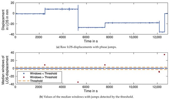 The signal paths of both GBRs cross the district road, where passing vehicles cause disturbances in the signal. The disturbances are mostly broadband noise, but they can also contain phase jumps when the phase is incorrectly unwrapped. Figure 9a shows the LOS-displacements of Target 1, measured by GBR 1. The clearly visible jumps cause shifts in the mean values in the order of several millimetres. For detecting these jumps, median windows with a window size of 10  are calculated and differenced once, as described in Section 2.3.1. The resulting values are displayed, together with a threshold determined as a multiple of their standard deviation in Figure 9b. All jumps are correctly detected by this threshold and removed from the displacement time series.