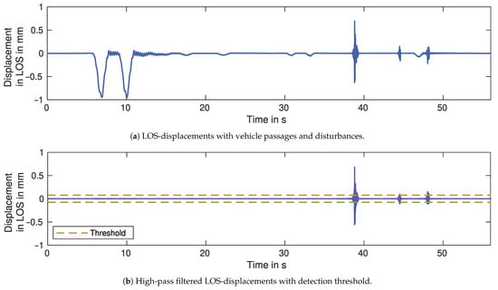 As discussed in Section 2.3.2, vehicles or other objects passing through the signal path cause broadband noise to be superimposed on the displacement time series. The detection and removal of these disturbances are shown in Figure 10a for a section of the LOS-displacements of Target 1. The time series contains displacements of the bridge caused by trucks and cars passing over it, as well as disturbances in the form of broadband noise. Since the bridge displacements mostly contain low-frequency components which are smaller than 10 , the disturbances are easily detected by high-pass filtering of the time series and the application of a threshold calculated as a multiple of the standard deviation of the filtered time series. Figure 10b shows the LOS-displacements after applying the high-pass filter with a cut-off frequency of 15 . All disturbances exceed the threshold and, therefore, are correctly detected.