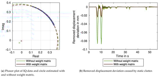 Moving objects and measurement targets at the bridge cannot be distinguished if they are in the same range cell. The corresponding parts of the measurement have to be removed, as discussed in the previous section. However, static targets have a systematic influence on the measurement, which can be determined by the circle fit algorithm proposed in Section 2.4. Figure 11a shows the estimation results in a phasor plot of the complex IQ components. The circle parameters are estimated without a weight matrix (green) and with a weight matrix (red), as described in Section 2.4.2. For both results, the circle centres differ slightly from the coordinate system’s origin. Therefore, static clutter is present in the signal. By subtracting the deviation from the complex signal and reprocessing it, the static clutter is removed. Figure 11b shows the deviation that is removed from the section of the displacement time series. It is proportional to the LOS-displacements with values in the order of 8% for the estimation without a weight matrix (green) and 2% for the estimation with a weight matrix (red). See also Figure 10a as a comparison.