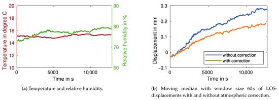 For the atmospheric correction, we install atmospheric sensors near GBR 1. The sensors measure temperature and relative humidity, as shown in Figure 12a. During the measurement, the humidity rises by about 7%. The temperature varies only minimally in the order of 1 . Figure 12b shows the LOS-displacements with and without the atmospheric correction (see Section 2.5). A moving median is applied to the graphs, to better visually compare the drift in both time series. The approximately linear drift is only partially reduced by the atmospheric correction. To remove the remaining drift, the third approach discussed in Section 2.5 can be used.