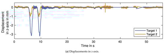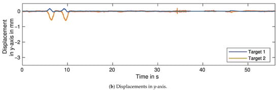 Every processing step has an influence on the measurement uncertainty, either through changes in the amplitude time series or through a propagation. The measurement uncertainty is initially estimated from the SNR of the amplitude, as discussed in Equations (3) and (4). Table 2 shows these estimates for the displacement in LOS in a range of 0.02 mm to 0.14 mm. Removing the disturbances reduces the amplitude variance, which results in lower estimates for the measurement uncertainty. The removal of static clutter influences the mean value of the amplitude, thus increasing or lowering the uncertainty. After clutter removal, the uncertainty values are in the range of 0.02 mm to 0.03 mm, except for Target 1 measured by GBR 1, which has a significantly lower value. These values are now propagated, as discussed in Section 2.6.2. The resulting uncertainty for the projected displacement in the y- and the z-axis is lower than   in all cases.