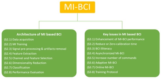 Figure 1 breaks down the contents of the entire article. This review article is divided into two parts. The first part of this article introduces the Architecture of MI based BCI. More specifically, how the EEG signal is captured from the brain is described under Section 2.1. In Section 2.2, we discuss how during the calibration phase the user acquires skills to modulate brain waves into control commands. The signal pre-processing subsection explains how unwanted artifacts are removed from the EEG signal to improve the signal to noise ratio. Section 2.4 discusses different approaches to extract information that is related to a motor imagery event in terms of features that are finally classified into control commands. Subsection on Section 2.5 and Section 2.6 deals with issues related to finding optimal channels or features and reducing dimensionality of feature space in order to improve BCI performance. Section 2.7 provides details of how features are classified into control commands. Lastly, Section 2.8 covers how to evaluate the performance of BCI. The last part of this article discusses the key issues that need further exploration along with the current state of the art that address these research challenges.