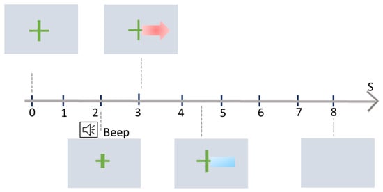 The trial time vary depending on scenario. Typically, one trial of graz training protocol lasts eight seconds, as illustrated in Figure 4. At the outset of each MI trail, which is t = 0 s, a fixation cross is displayed to instruct the user that the trial has started. After a two-second break ( t = 2 s), a beep is used to prepare the user for the upcoming MI task. This 2 s break acts as a baseline period to see the MI task pattern in the EEG signal in the upcoming MI task at t = 3 s. After three seconds, an arrow appears on the screen indicating the MI task. For example, the arrow in the right direction means right hand motor imagery. No feedback is provided during the initial training phase. After the system is calibrated, feedback is provided for four seconds. The direction of the feedback bar shows recognition of the MI pattern by system and the length of the bar represents confidence of the system in its recognition of the MI class pattern.