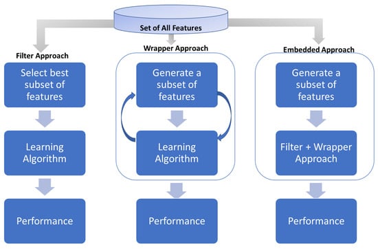 Wrapper approaches select a subset of features, present them as input to a classifier for training, observe the resulting performance, and stop the search according to a stopping criterion or propose a new subset if the criterion is not satisfied [56]. Algorithms that fall under the wrapper approach are mainly searching and evolutionary algorithms. Searching algorithms start with an empty set and add features (remove features) until a maximum possible performance from the learning algorithm is reached. Usually, a searching algorithm’s stopping criteria is until the number of features reaches a maximum size that is specified for the subset. On the other hand, evolutionary algorithms, such as particle swarm optimization (PSO) [61], differential evolution (DE) [62,63], and artificial bee colony (ABC) [64,65], find an optimal feature subset by maximizing fitness function’s performance. Wrapper methods find a more optimal feature subset when compared to filter methods, but the computational cost is very high, thus not being suitable for very large data-sets.