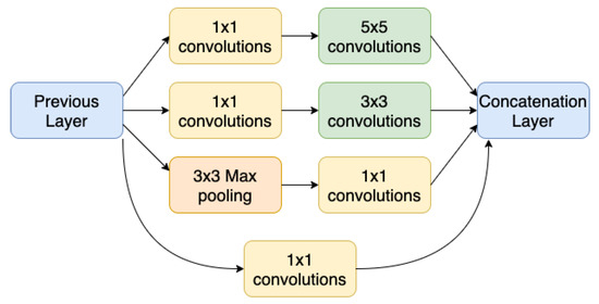 Inception [16] is a CNN architecture that was developed by Google in 2013–2014. It is inspired by an architectural concept, called network-in-network [17]. The unique components of an Inception network are modules that look like small independent networks, which are formed by parallel branches. This structure helps the network learn spatial features separately, which is more efficient than learning them in unity.