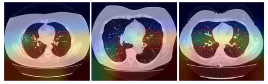 Figure 4 shows a Grad-CAM visualization for the COVID-19 class with some images from the test dataset. It is possible to notice that the areas with ground-glass opacities and consolidations, typical findings in patients with COVID-19 [36], are highlighted in the heatmap, as indicated by the red outline.