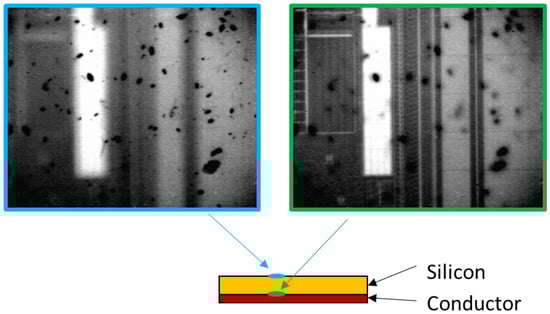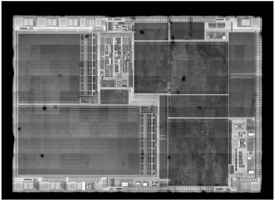 On the one hand, this system gave the necessary precision (±1 μm resolution) to find out the target structures for the secure characterization while keeping the IC functional (non-invasive vision). On the other hand, the result was poor image quality—low-contrasted, gray-leveled and noisy. Speckle noise is inherent to infrared systems; here, it was heavily worsened by optical magnification. Moreover, this not thermally insulated sensor is subject to the thermal inference of the environment, which disturbs the vision process. This thermal inference comes from the third-party equipment that emits the SWIR light, which is reflected by the conductive materials and thus triggers the InGaAs sensor. Additionally, the image quality depends on the material reflectance to light, which may vary with the technology used to build the IC. The random presence of artifacts or contaminants on the silicon layer may also impair the view of the SOI. These contaminants locally block the light casting shadows on the SOI under it (see Figure 2).
