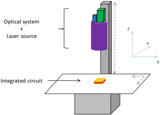 Representation of a bench used for laser-injection-based IC characterization. Each 3D scanning axis is motorized in the 3D coordinate system. The vertical column represents the Z axis, along which the optical system moves thanks to a motor. The horizontal tray, where the IC is placed, is motorized according to the XY plane.