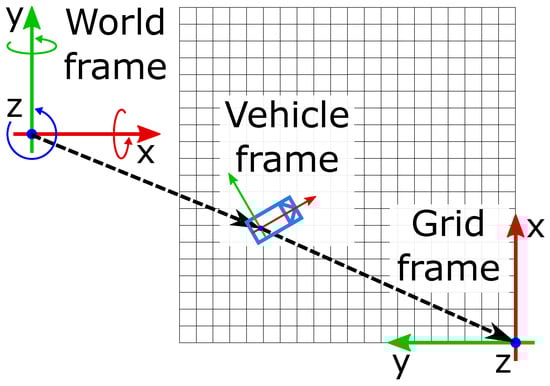The environment’s representation on the grid is discrete, although the vehicle is moving and turning in the real, continuous world. In order to eliminate discretisation errors which would occur if the map were to be rotated, the host performs its motions relative to the grid with a fixed orientation [].
