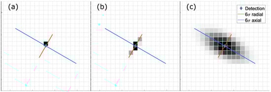 Two-dimensional probability models compute the occupancy distribution in Cartesian or polar coordinates around the detection (Figure 2c). The probability value is usually approximated as a Gaussian distribution with the constraint that the sum of all evidence should be equal to the detection’s existence probability [].