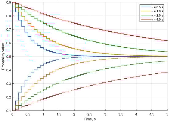 The simulations for the third evaluated filtering method—decay—were performed similarly to previous ones. The decay factor is driven by the mean lifetime () value. It is estimated that the larger the , the slower the decay, which decreases probabilities.
