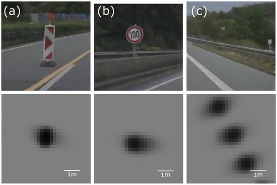 Examples of the occupancy grid representations of highway pole-like objects with corresponding video frames: (a) traffic bollard; (b) sign; (c) guardrail. The occupancy grid is generated using a single automotive-graded radar located in front of the vehicle.