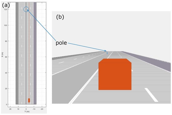 The simulation has been designed using the Driving Scenario Designer toolbox available in Mathworks MATLAB. The structure of the simulation was simplified to a minimum to limit the calibration parameters and to optimise evaluation time. It mimicked the highway scenario conditions: the host moved with a velocity of 30 m/s, which corresponds to 108 km/h, on a straight road. The only obstacles in the scenario were rectangular poles with dimensions of  cm. One of these obstacles in the simulation view is presented in Figure 6.