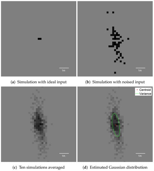 The ideal pole object after accumulation occupied up to two cells on the occupancy grid (see Figure 7a). The generated ideal detections were used to simulate different noise conditions with variance of the experimental sensor ( m and ). In order to imitate false positive readings, the confidence level of detections was lowered to 90%, meaning that one detection could produce at least  occupancy evidence probability. Due to the application of random detection spread on only around 100 detections, a single simulation run might generate sparse distribution of the pole on the occupancy grid (Figure 7b). In order to visualise the distribution of occupancy grid representation, the simulations were repeated 10 times, and averaged results are depicted in Figure 7c. On top of the accumulated data, the centroid and variance are presented in Figure 7d.