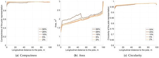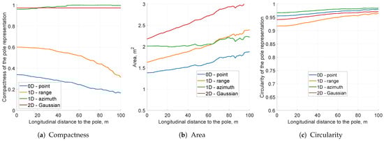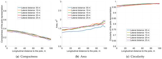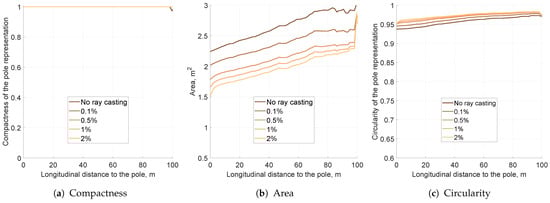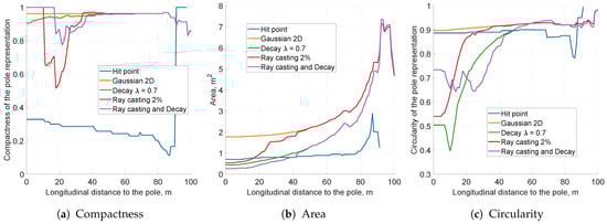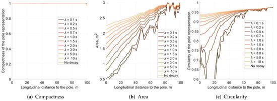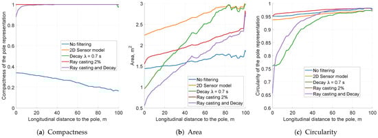 The addition of decay filtering decreases the area and makes the pole shape more circular. Conversely, the ray casting itself can reduce the area of the object for closer ranges. The combination of decay and ray casting yields the best results over the largest range of distances. For distances closer than 40 m from the pole, the object representation had an estimated area lower than 1 m, and circularity reached  (see Figure 18b,c). These results are close to the ideal object variance of  m and supersede the ideal circularity of .