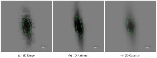 For the radar with specified uncertainty characteristics, both 1D azimuth and 2D sensor models may be applied. Nevertheless, comparing 1D azimuth and 2D Gaussian grid snapshots, the 2D sensor model delivered smoother results (Figure 10b,c. More complex modelling utilised for the two-dimensional distribution can encode more information in cell occupancy probabilities and may yield better results after further filtering steps. Based on that observation, for the next parameter’s evaluation, the 2D probability model was selected.