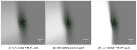 The free space simulation results are presented in Figure 11 and Figure 12. Simulations were launched with a 2D Gaussian sensor model for the pole moved by 10 m laterally. The free space gain factor is represented in percent, which denotes how much of the evidence was introduced for every ray cast. For example, a 2% gain means that in every fusion step the probability of  was fused into the cell (7).