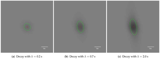 The application of the 2D Gaussian sensor model makes the pole object representation fully compact, although the estimated variance is high (Figure 17b). In order to lower the discrepancy, the decay and free space determination methods were applied. Ray casting with a gain of  decreases the pole area evenly for all longitudinal distances from the vehicle. Conversely, decay with a mean lifetime of  s rapidly lowers variance for shorter ranges. Decay also lowers the circularity value, making the output pole more circular (Figure 17c).