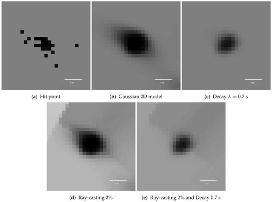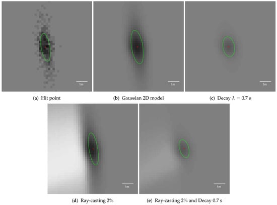 The application of combined filtering and decay methods lowers the occupancy probability on the resultant grid. Nevertheless, reduced cell confidence does not mean lack of occupancy grid quality. The ray cast and decayed snapshot presented in Figure 17e reaches the occupancy probability value of . This level of confidence is enough for most decision-making processes. Moreover, computing the occupancy probability over cells within the  range, depicted as an ellipse, gives almost certain occupancy in this area.
